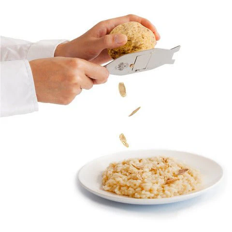 This product also includes a stainless steel truffle slicer.